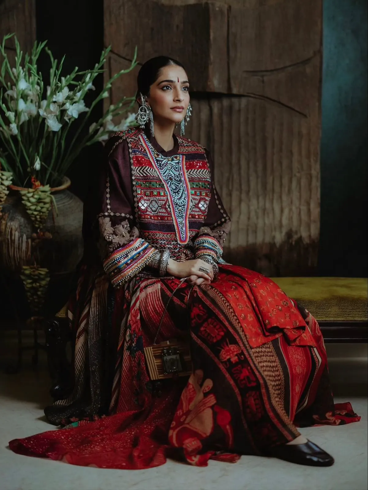 Originating from the Kutch region of Gujarat, this tribal embroidery is known for its mirror work (“abhla”), geometric motifs, and vibrant threadwork. The combination of patchwork and mirror elements in Sonam’s outfit is a direct nod to this tradition.